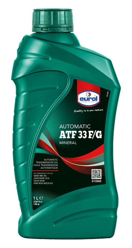 Eurol ATF 33 F/G is speciaal ontwikkeld voor bepaalde vaak oudere automatische transmissies van Ford, Borg Warner Mazda, Toyota, Volvo en Saab, alsmede ook modernere (automatische) transmissies van bijvoorbeeld Range Rover Discovery en tal van hedendaagse (land)bouwmachines. Eurol ATF 33 F/G heeft een zeer hoge stabiele viscositeitsindex en een laag stolpunt, waardoor het dankzij de uitstekende wrijvingseigenschappen in een zeer breed temperatuursbereik kan functioneren. Verder biedt het weerstand tegen corrosie, schuimvorming en oxidatie. Bovendien heeft Eurol ATF 33 F/G goede slijtagewerende eigenschappen en is het neutraal ten opzichte van afdichtingen en non-ferro metalen. Eurol ATF 33 F/G is naast toepassing in (automatische) transmissies ook geschikt voor stuurbekrachtigingen, koppel- omvormers en andere hydraulische apparatuur waar een type 33F/G wordt voorgeschreven. Dit produkt mag niet worden toegepast in automatische transmissies waar Dexron, Mercon of andere types zijn voorgeschreven.