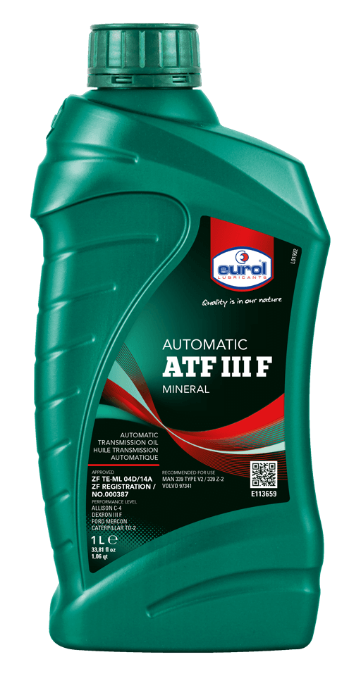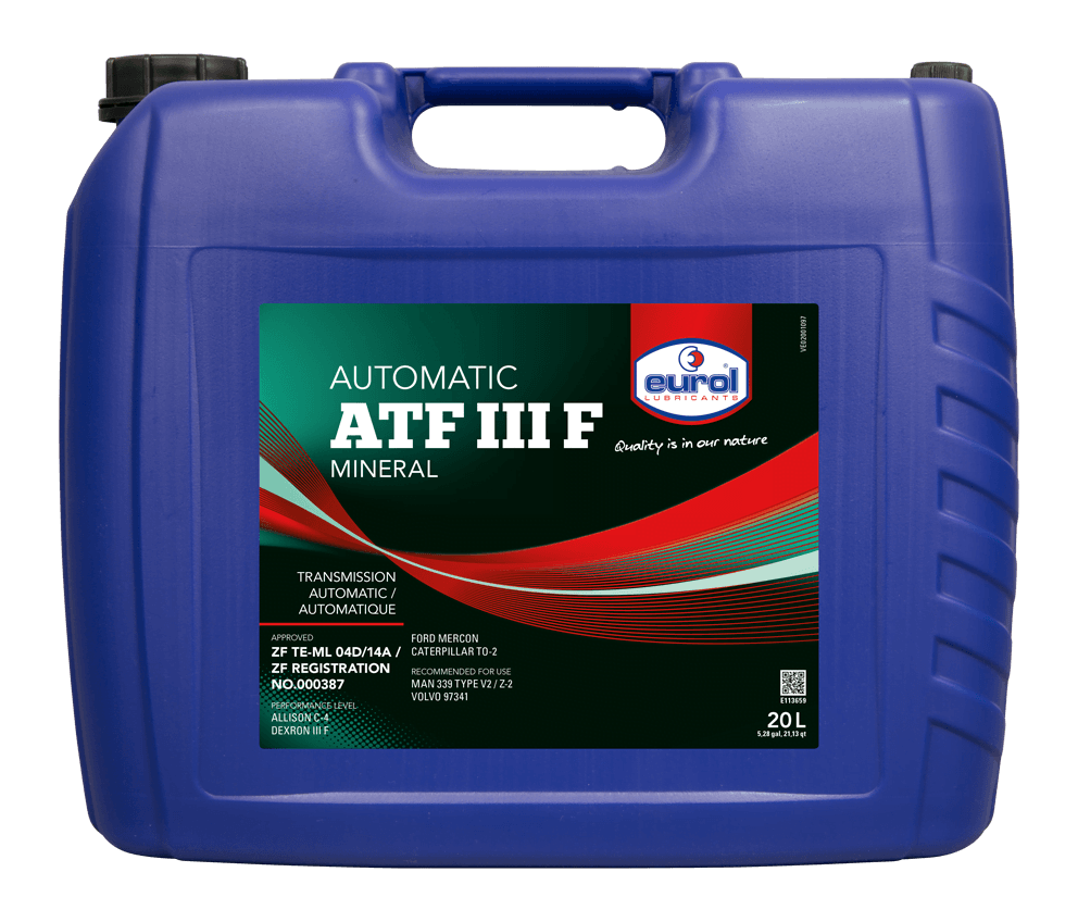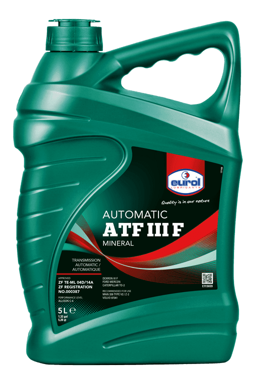Eurol ATF III F is een minerale automatische-transmissieolie, speciaal ontwikkeld voor oudere en nieuw automatische transmissies van GM en Ford en vele andere merken. Bovendien is het geschikt voor stuurbekrachtigingen, hydraulische systemen en roterende luchtcompressoren waar een uitstekende vloeibaarheid bij lage temperatuur wordt geëist. Eurol ATF III F heeft een zeer hoge viscositeitsindex en biedt weerstand tegen corrosie en schuimvorming. Bovendien heeft het goede anti-oxidatie en anti-slijtage eigenschappen. Eurol ATF III F heeft een uiterst laag stolpunt waardoor soepel schakelen na de koude start gegarandeerd is. Deze ATF tast geen afdichtings-materialen aan.