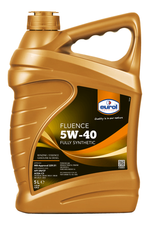 Eurol Fluence 5W-40 is een vol-synthetische olie voor gebruik in benzine- en dieselmotoren van personenwagens en lichte bedrijfswagens. Bovendien wordt deze olie probleemloos toegepast in auto’s met katalysator, turbo en directe injectie. Eurol Fluence 5W-40, ontwikkeld met Eurol’s OPT additieven, biedt een extreem goede bescherming tijdens lange verversingstermijnen. Het is met name geschikt voor Euro-4 personen-wagens van Mercedes Benz, die MB norm 229.51 voorschrijven, om het dichtslibben van de roetfilters te voorkomen.