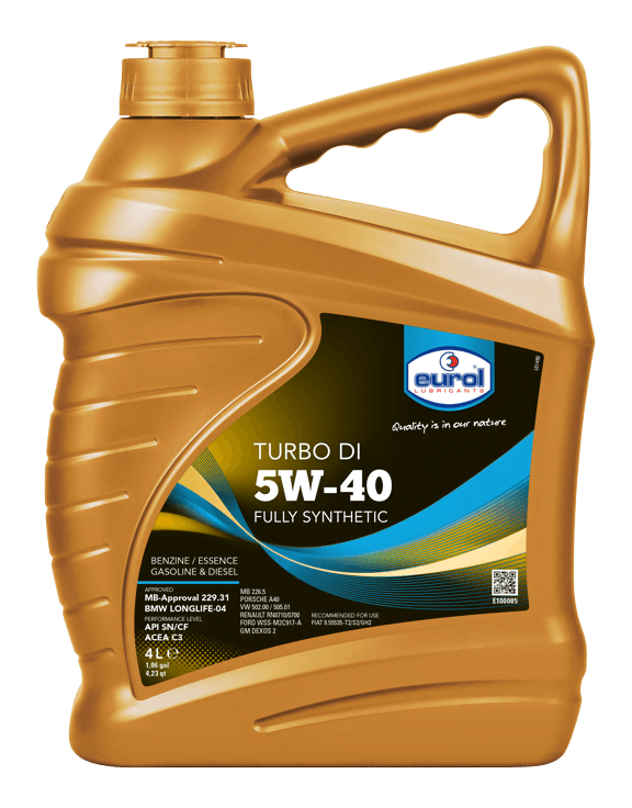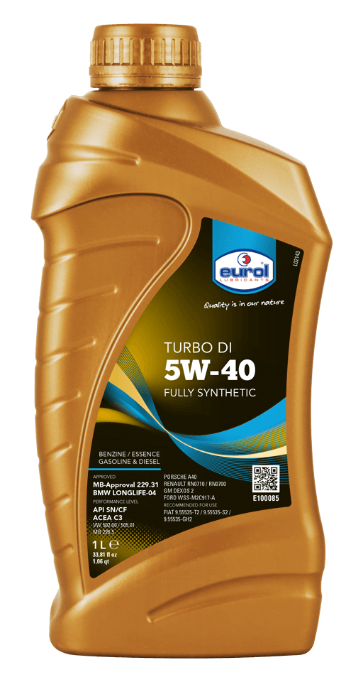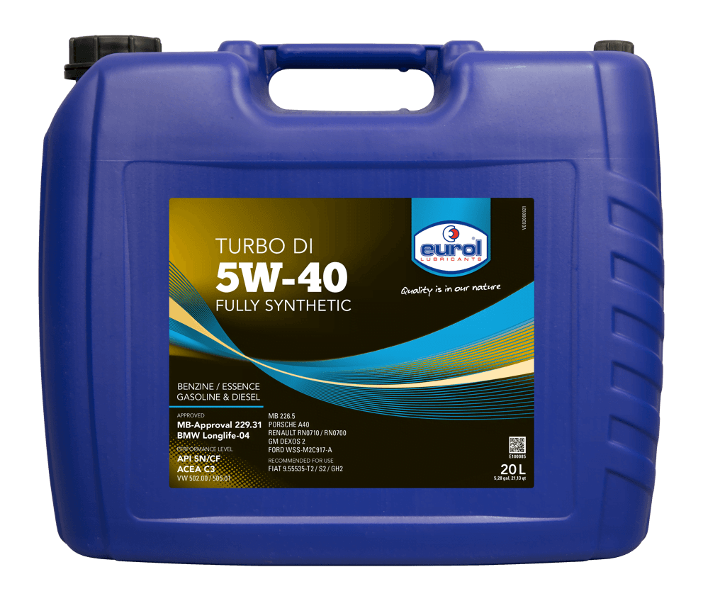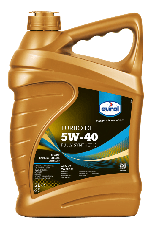 Eurol Turbo DI 5W-40 is een vol-synthetische olie voor gebruik in benzine- en dieselmotoren van personenwagens en lichte bedrijfswagens. Bovendien wordt deze olie probleemloos toegepast in auto’s met katalysator, turbo, roetfilter en directe injectie. Eurol Turbo DI 5W-40 is ontwikkeld met Eurol OPT-additieventechnologie, dat minder fosfor, zwavel en sulfaat as bevat, zodat roetfilters en katalysatoren niet verstopt raken en hun levensduur niet bekort wordt.